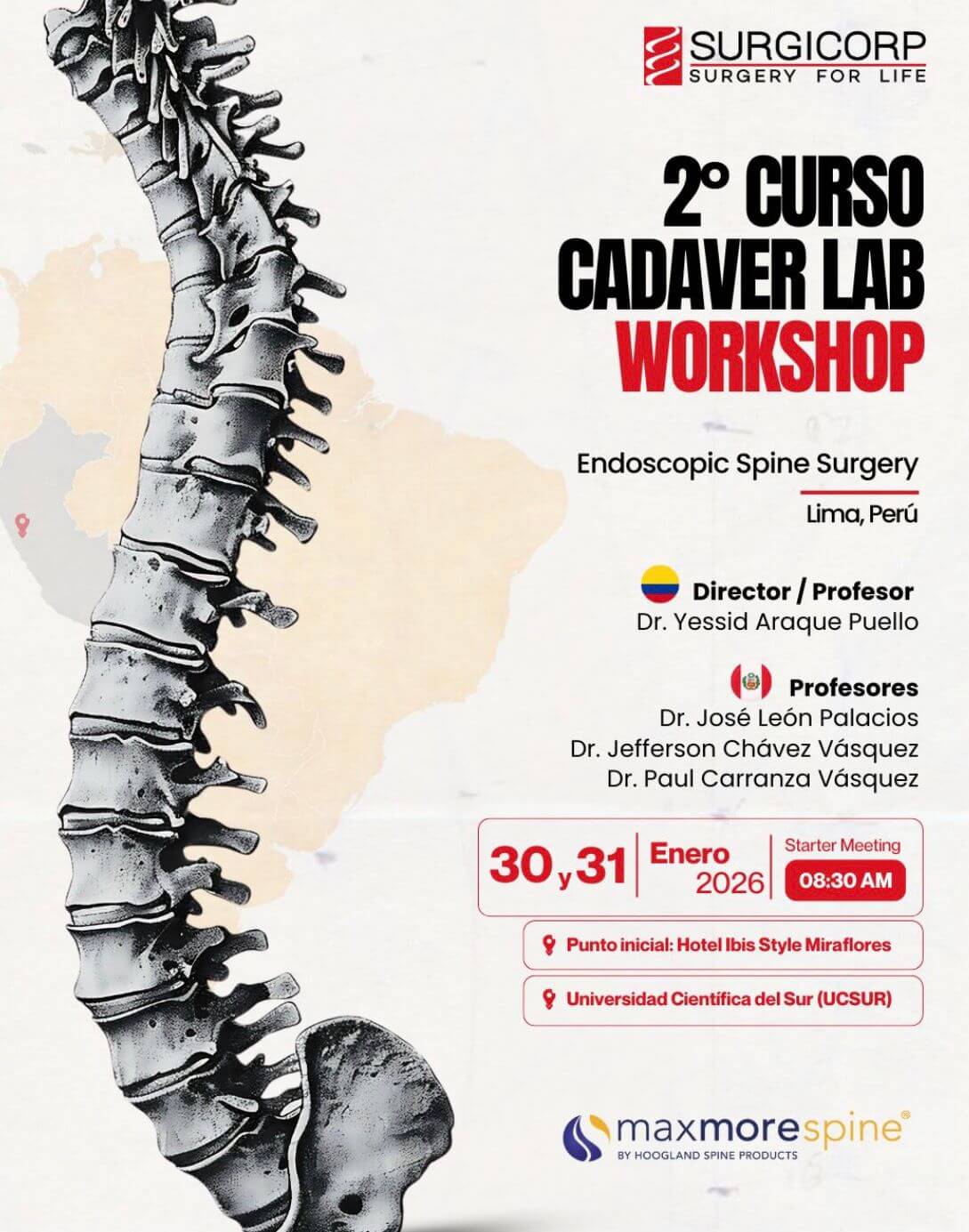 Welcome to the 2nd Cadaver Lab Workshop Course of Endoscopic Spine Surgery of Surgicorp, our official business partner in Peru. This intensive program combines key theoretical training and hands-on training in a cadaveric laboratory, focussed on the domain of modern and minimally invasive endoscopic techniques: real practice, clinical case analysis and strategies to optimize surgical results and complication management.